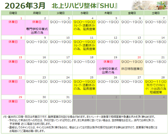 2月最終週の営業予定と3月の営業日程変更について